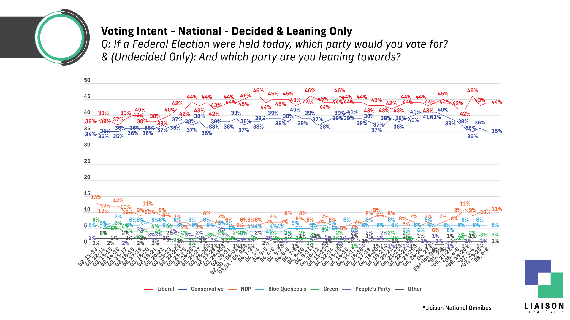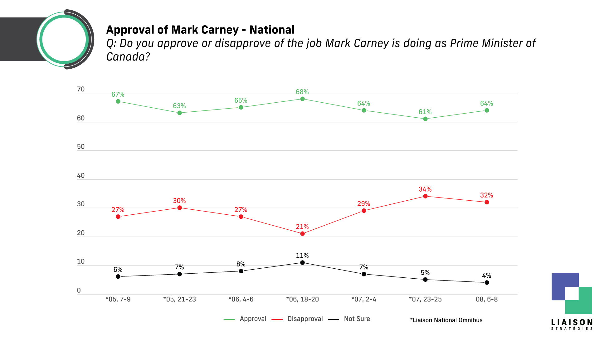 August 13, 2025 (Toronto, ON) – A new Liaison Strategies poll for the National Ethnic Press and Media Council of Canada finds Mark Carney's Liberals with a strong 9 point national lead over the Conservative Party while Carney himself enjoys a 64% approval rating.