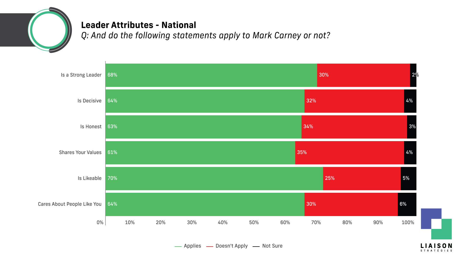 The Prime Minister remains broadly popular, both in his personal approval and in perceptions of his leadership. Sixty-four percent of Canadians approve of the job Carney is doing, 68% see him as a strong leader, 64% say he’s decisive, 63% view him as honest, and 70% find him likeable. These are strong across the board. Sixty-one percent say he shares their values, and 64% believe he cares about “people like you.”