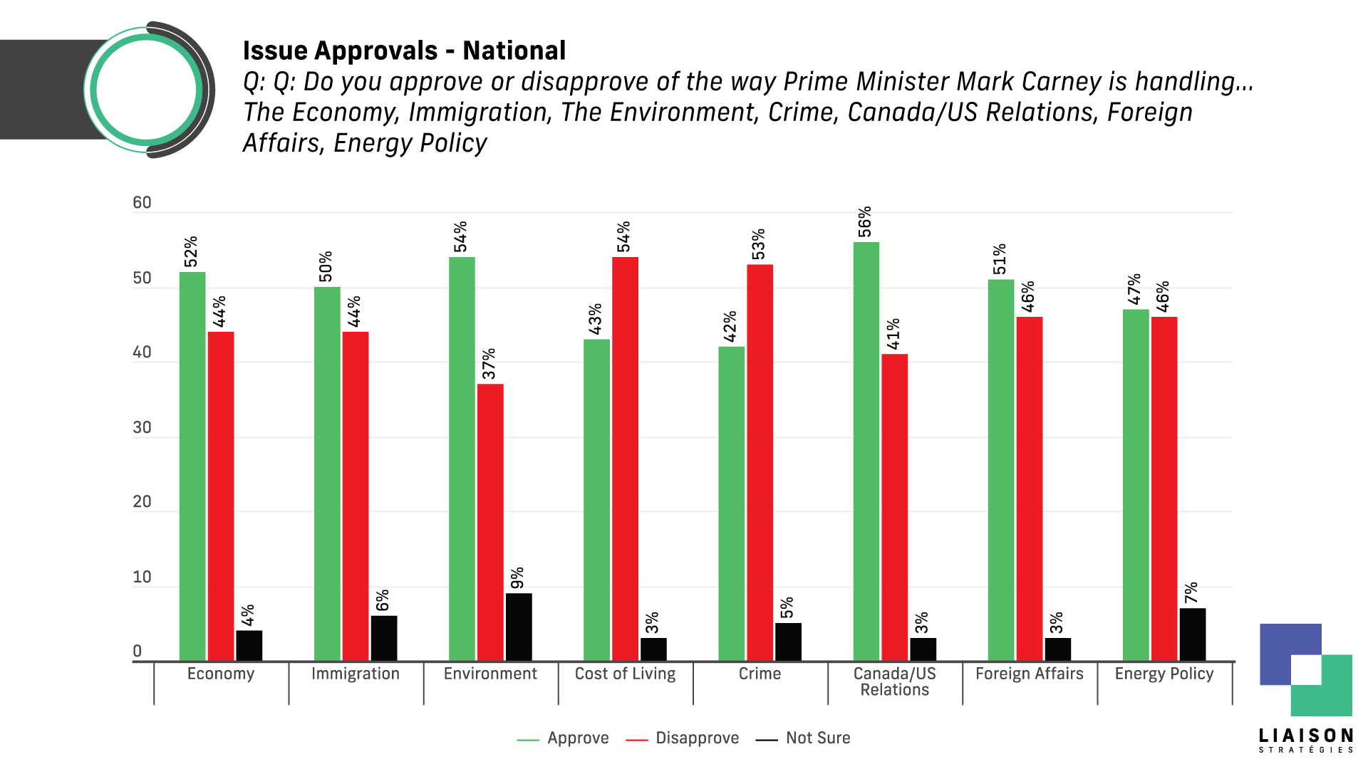 Carney’s weaker spots are in how Canadians rate his handling of specific issues. While he scores well on most, energy policy is essentially split (47% approve, 46% disapprove), and he’s underwater on cost of living (54% disapprove) and crime (53% disapprove).