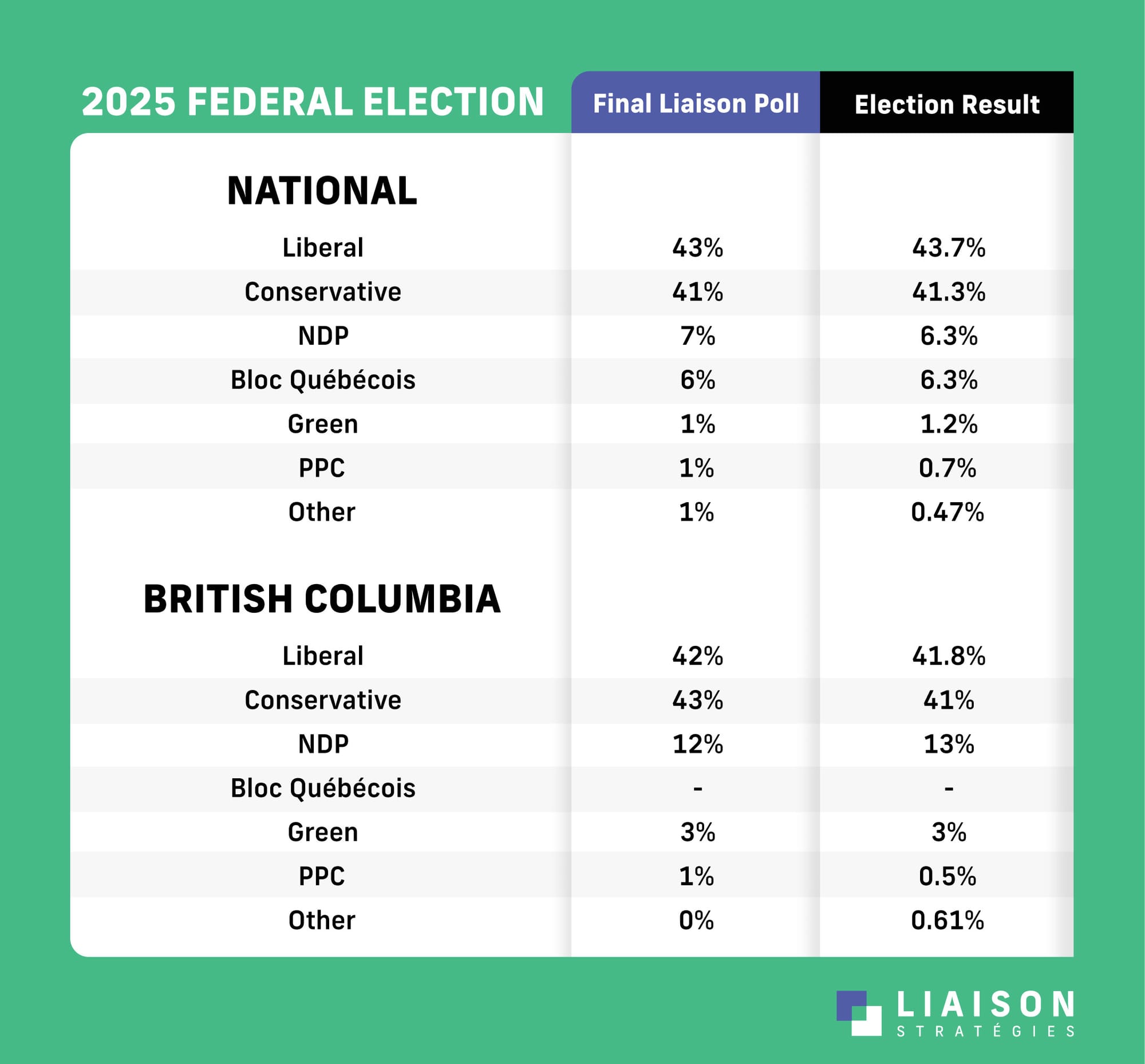 Conducted from May 2-4, 2025, using interactive voice response technology, the Liaison poll surveyed 800 British Columbia voters. The margin of error for the poll is +/- 3.45%, 19 times out of 20.