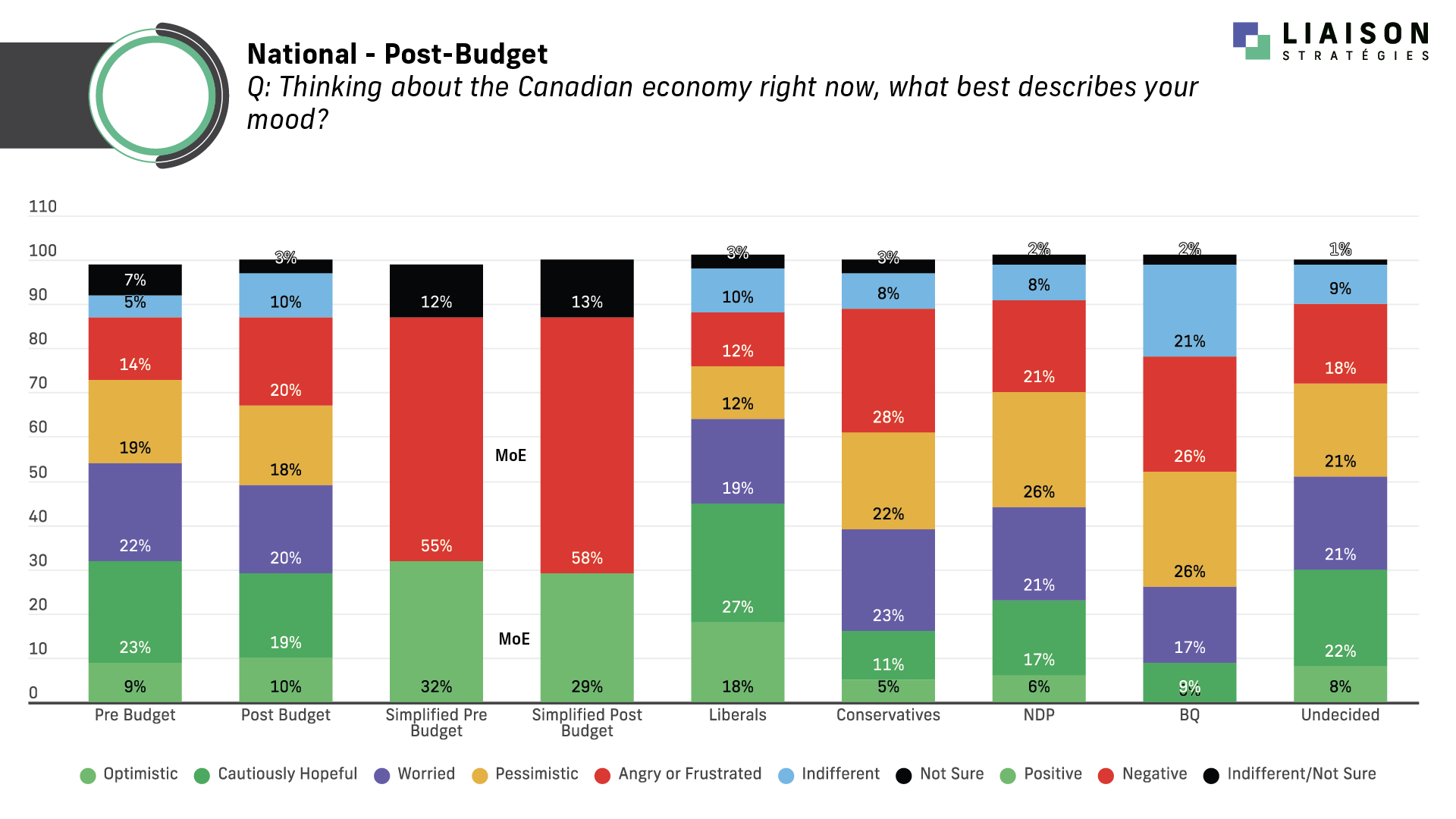 That being said 58% say they are worried, pessimistic or frustrated about the Canadian economy compared to 55% pre-budget and 50% say they don't believe the budget will affect their personal finances positively.