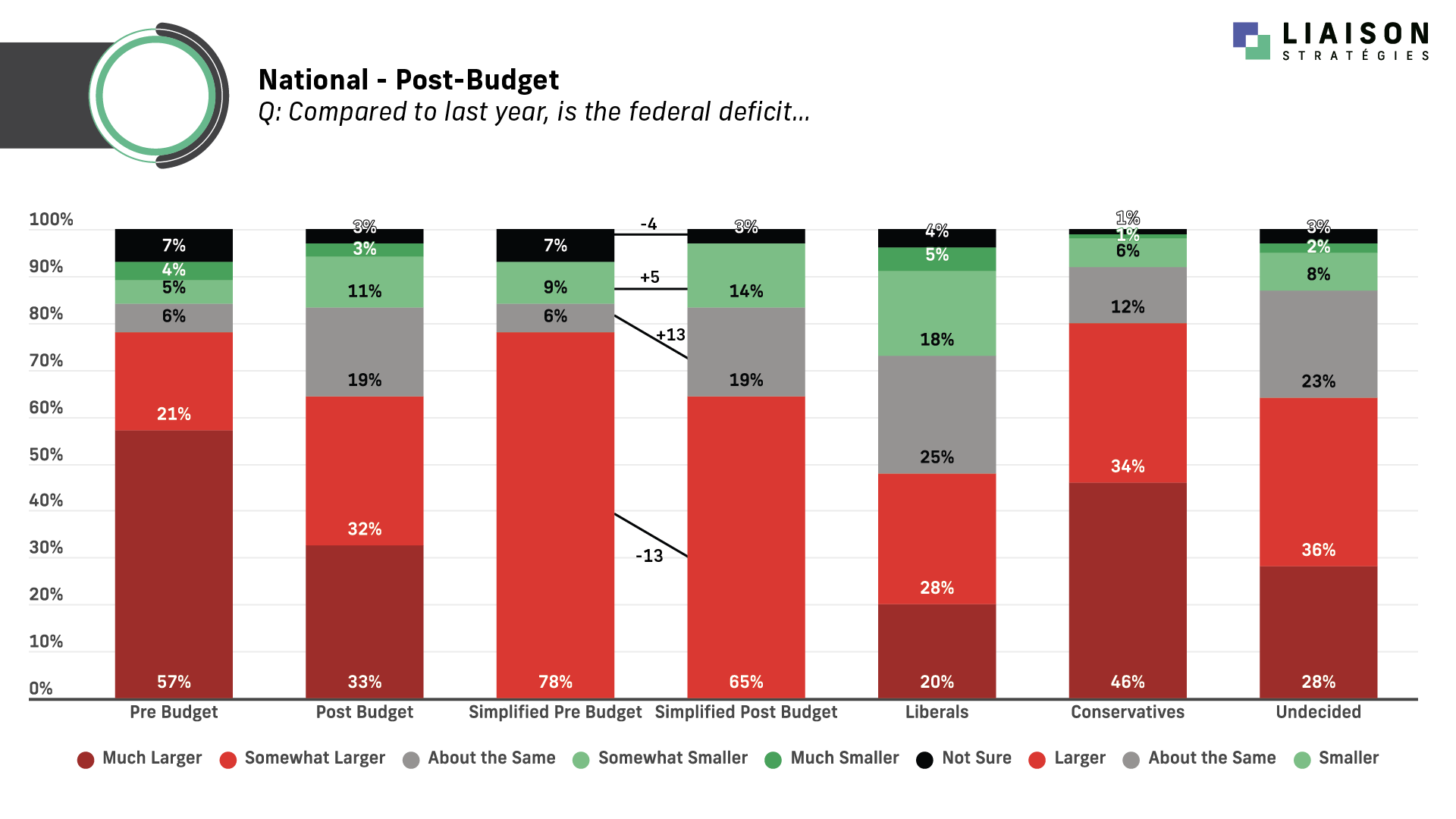 Before the budget, 78 percent told us the deficit was larger. After the budget, that number softens to 65 percent in our simplified version of the question, and the share saying the deficit is “much larger” drops by 24 points.