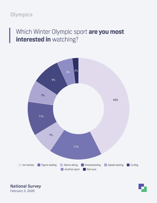Meanwhile, in the heated rivalry between ice hockey and figure skating, hockey is the clear top draw: 43% of Canadians say it’s the sport they’re most interested in watching, more than double the share for figure skating (17%).