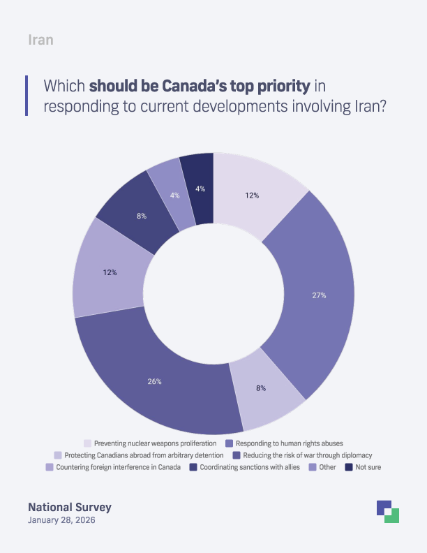 Asked what should be Canada’s top priority in responding to current developments involving Iran, Canadians most often choose responding to human rights abuses (27%) and reducing the risk of war through diplomacy (26%). Preventing nuclear weapons proliferation (12%) and countering foreign interference in Canada (12%) follow, with protecting Canadians abroad from arbitrary detention (8%) and coordinating sanctions with allies (8%) next.