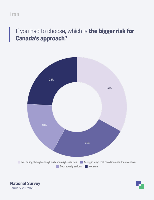 January 28, 2026 (Toronto, ON) – A new national survey of 1,000 Canadians finds the public pulling Canada in two directions at once: a strong appetite for a tougher stance on human-rights abuses in Iran, alongside a real caution about actions that could raise the risk of wider conflict.