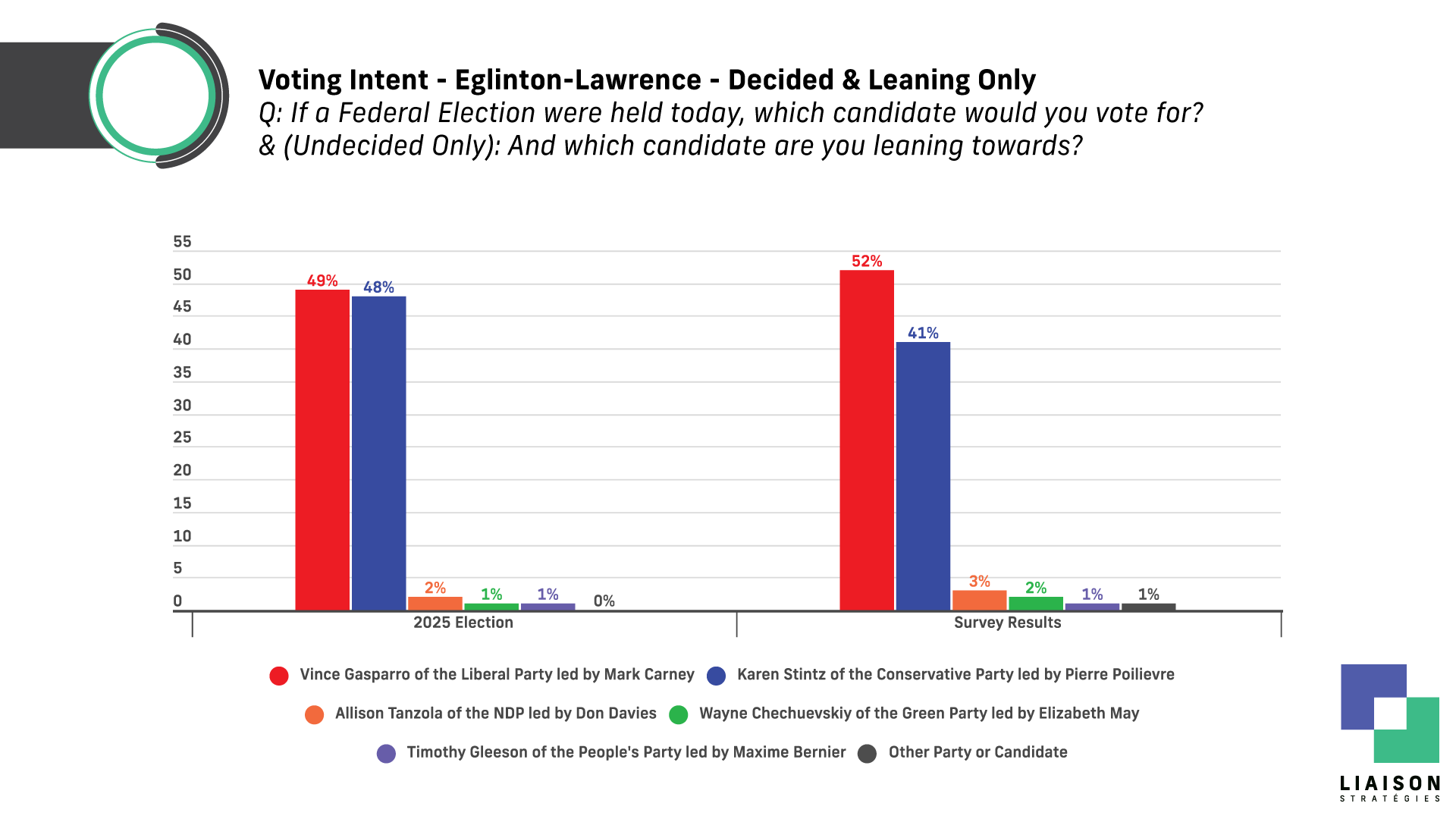 Conducted from November 24 to 30, 2025, using Interactive Voice Response (IVR), the survey polled 602 voters in Eglinton-Lawrence. The margin of error is ±3.99 percentage points, 19 times out of 20.