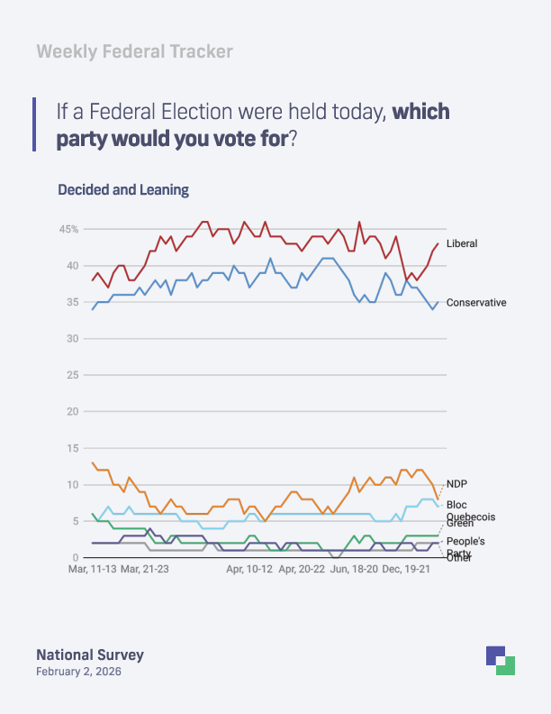February 2, 2026 (Toronto, ON) – A new Liaison Strategies national survey finds the Liberal Party of Canada maintaining an eight-point advantage over the Conservative Party of Canada. Among decided and leaning voters, the Liberals lead with 43% to the Conservatives’ 35%, with the New Democratic Party at 8%, and the Bloc Québécois at 7%. Simultaneously, Prime Minister Mark Carney's approval rating has reached an approval rating of 64%, while 56% of Canadians hold an unfavourable view of Conservative leader Pierre Poilievre.