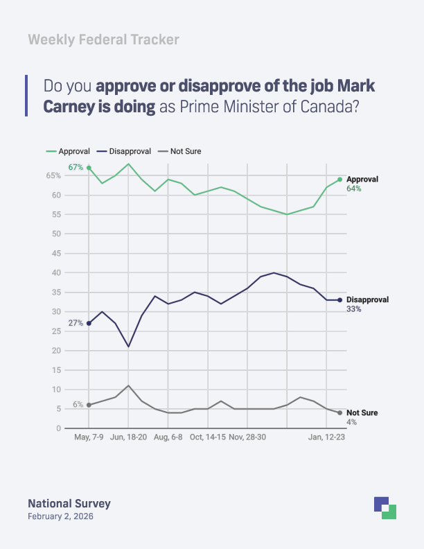 "Prime Minister Mark Carney's personal numbers continue to climb, with his approval now sitting at 64%. He is seeing his strongest support among Canadians aged 65 and older (69%) and in Atlantic Canada and Ontario (both at 70%). His net approval rating remains a powerful asset for the Liberal brand."
