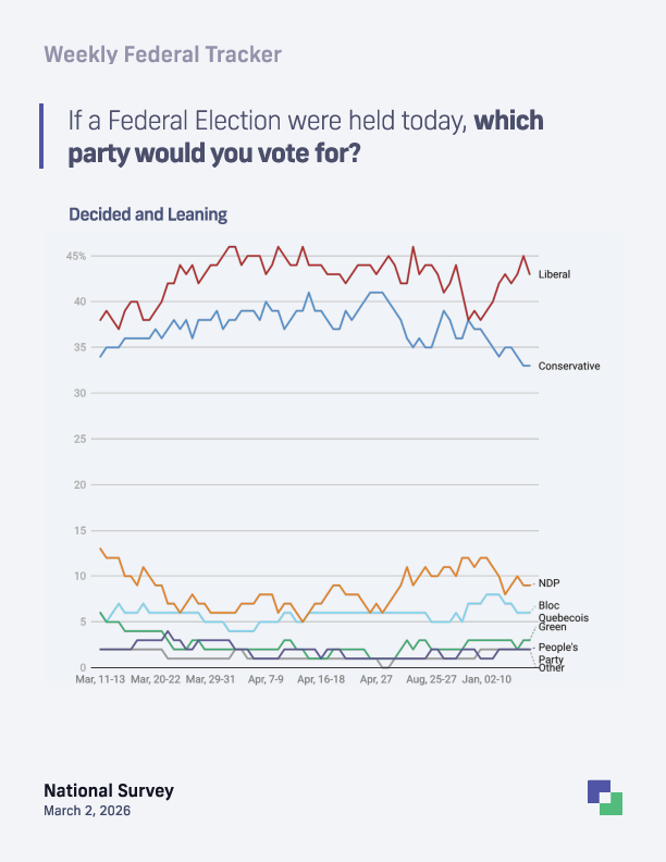 March 2, 2026 (Toronto, ON) – A new national survey released today by Liaison Strategies shows the Liberal Party of Canada, led by Prime Minister Mark Carney, holding a double-digit lead. If a federal election were held today, the Liberals would secure 43% (-2) of the decided and leaning vote, maintaining a significant 10-point advantage over the Conservative Party, which stands at 33% (no change).