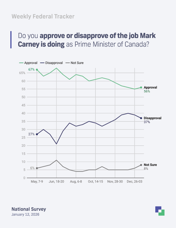 “Prime Minister Mark Carney’s approval has largely been drifting downward -especially over the last few months and weeks. That’s why this week offers a rare bit of positive movement: his approval ticks up one point to 56%. It’s well within the margin of error, but it may be an early sign that the decline has levelled off.”