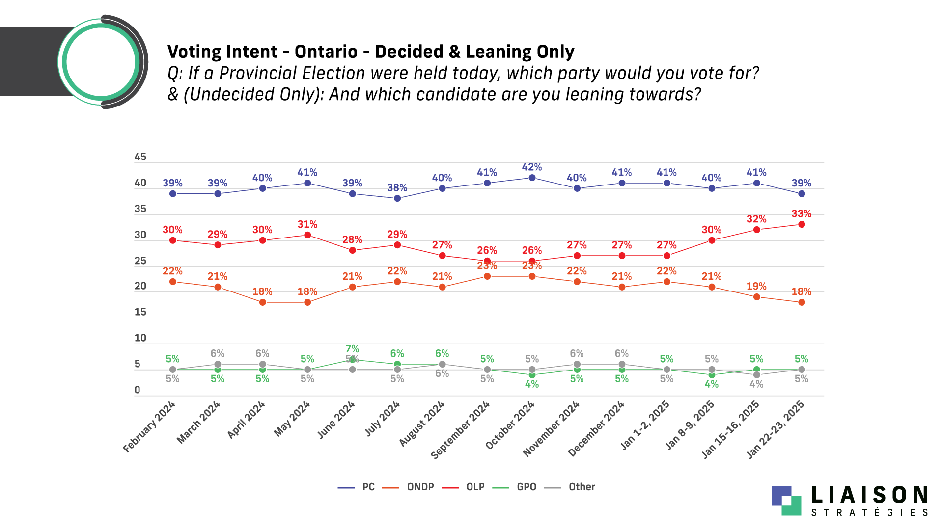 "The trendline is more telling than any single poll, and it’s clear: the Ontario Liberals are gaining momentum. Week by week, the race is tightening." said David Valentin, Principal at Liaison Strategies.
