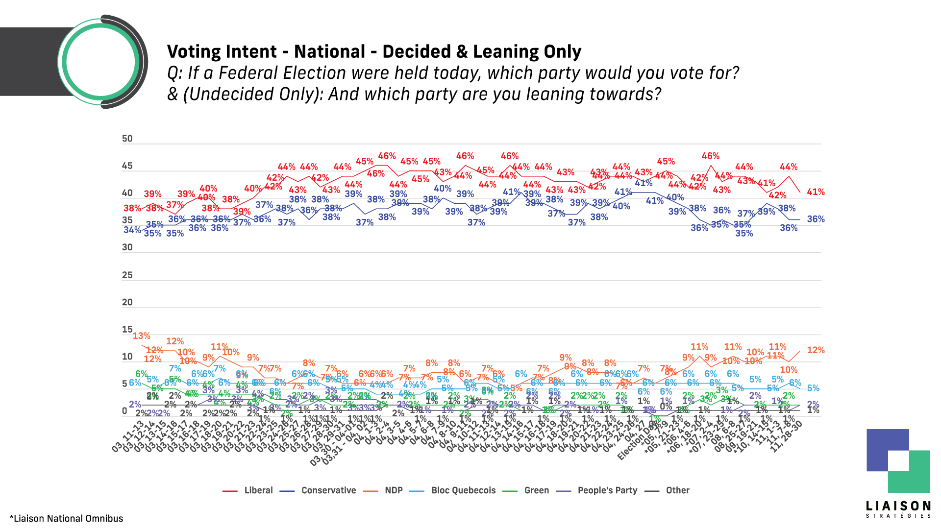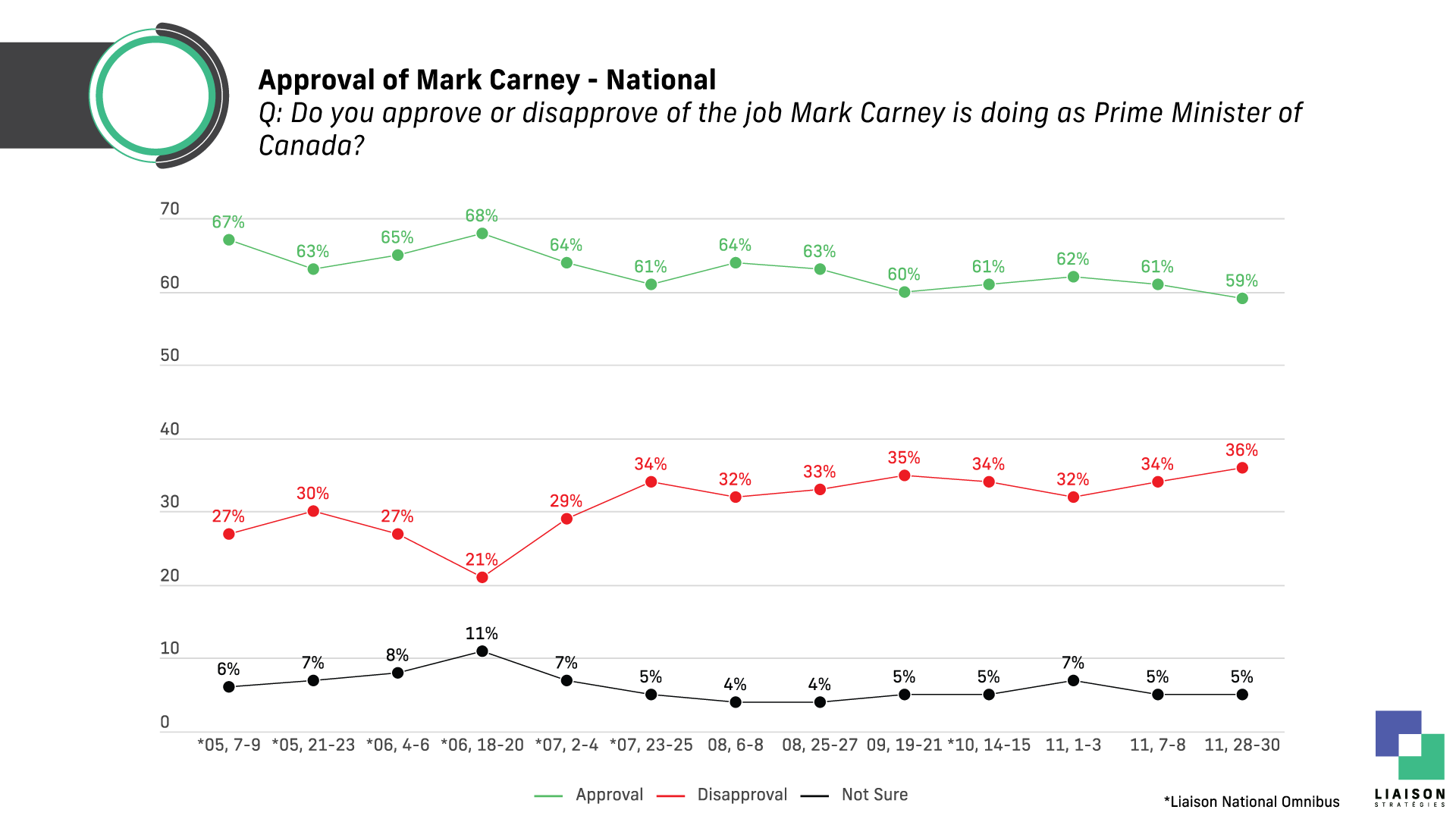 December 1 (Toronto, ON) – A new national Liaison Strategies poll conducted over the weekend shows the Carney Liberals down three points to 41%, while the Conservatives hold at 36%. Fielded after Carney announced a memorandum of understanding with Alberta on a pipeline, the survey also finds the NDP up two points to 12%, with some signs of life in British Columbia, where they now sit at 19%.