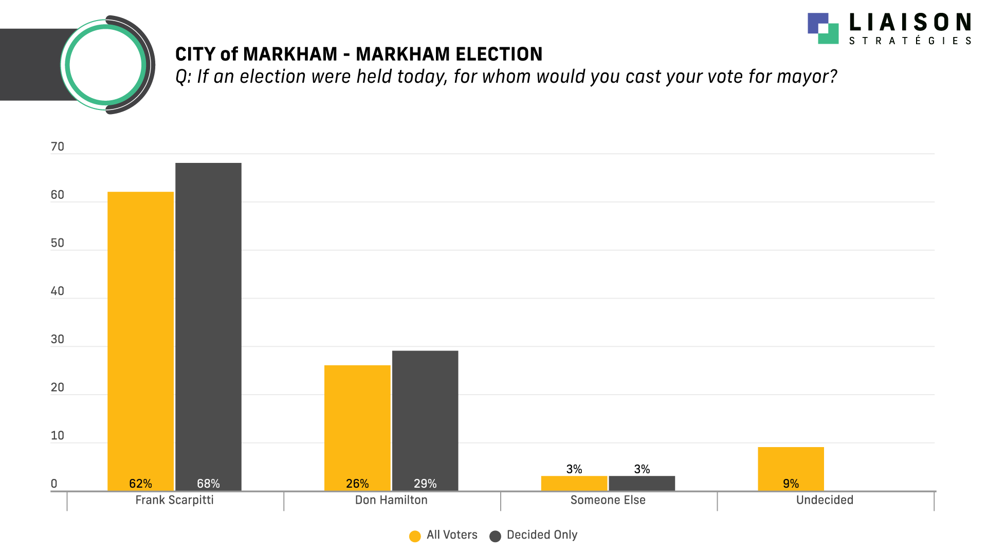 If an election were held today it would be smooth sailing for Markham mayor Frank Scarpitti. Matched against his 2022 opponent, Don Hamilton, Scarpetti would earn 68% of the vote compared to 29% for Hamilton. Next year's municipal elections are now less than one year away.