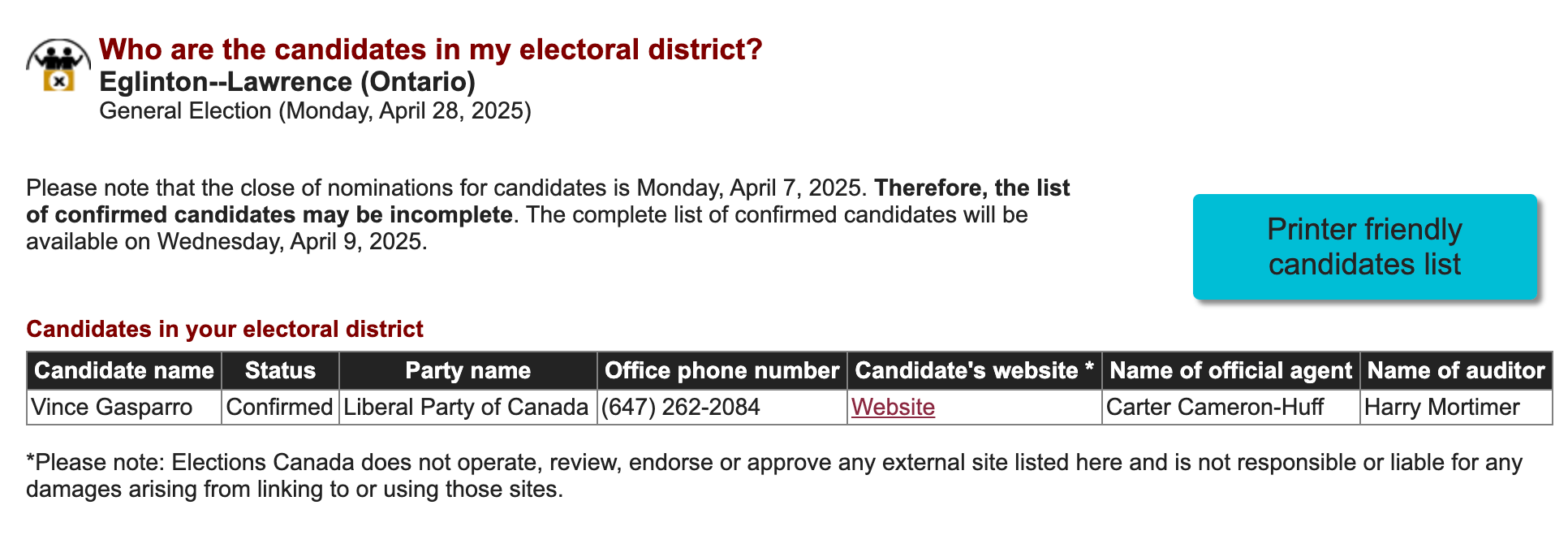 "Tomorrow marks the candidate nomination deadline for Elections Canada, but I wouldn’t expect a complete list right away. For example, in Eglinton–Lawrence -where I live - only one candidate is currently listed."