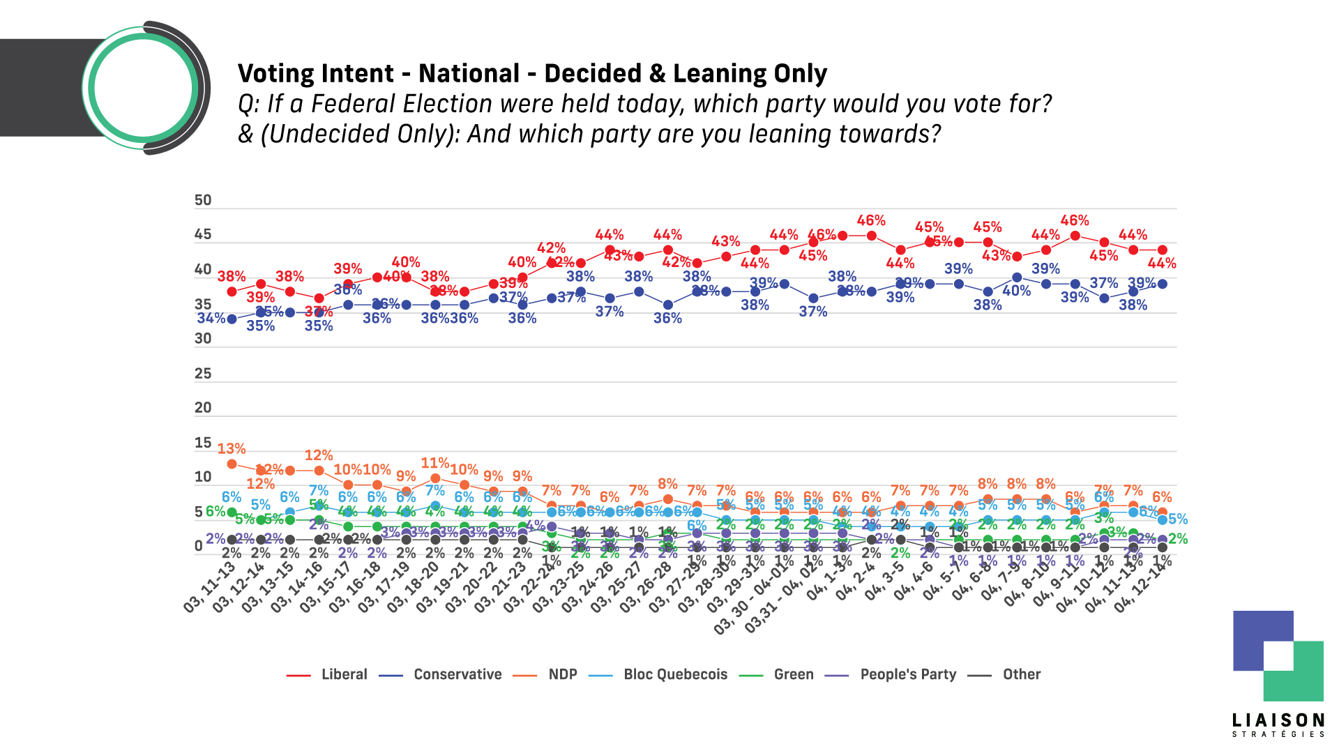 April 15, 2025 (Toronto, ON) – A new poll by Liaison Strategies for the National Ethnic Press and Media Council of Canada (NEPMCC), the industry association representing Canada’s non-official language newspapers, TV, radio, and online news media, finds the Liberals leading with 44% (no change) to the Conservatives 39% (+1).