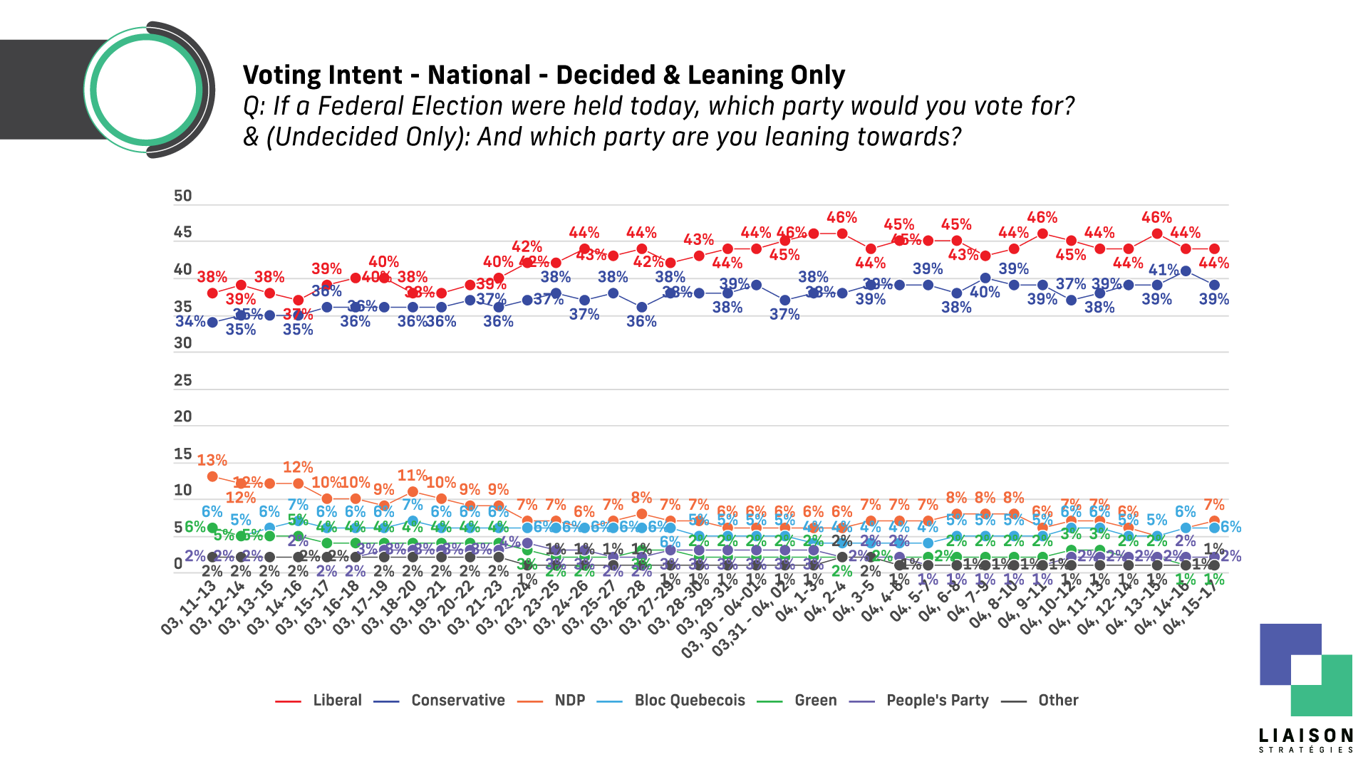 April 17, 2025 (Toronto, ON) – A new poll by Liaison Strategies for the National Ethnic Press and Media Council of Canada (NEPMCC), the industry association representing Canada’s non-official language newspapers, TV, radio, and online news media, finds the Liberals leading with 44% (no change) to the Conservatives 39% (-2).
