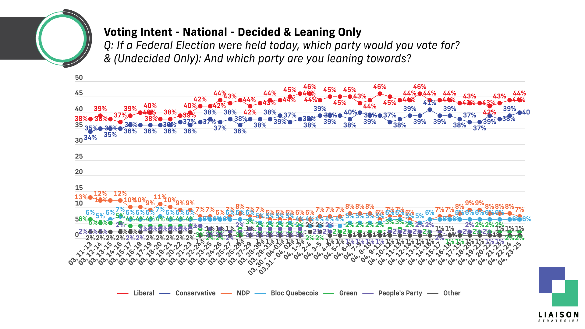 April 26, 2025 (Toronto, ON) – A new poll by Liaison Strategies for the National Ethnic Press and Media Council of Canada (NEPMCC), the industry association representing Canada’s non-official language newspapers, TV, radio, and online news media, finds the Liberals leading with 44% (no change) to the Conservatives 40% (+1).