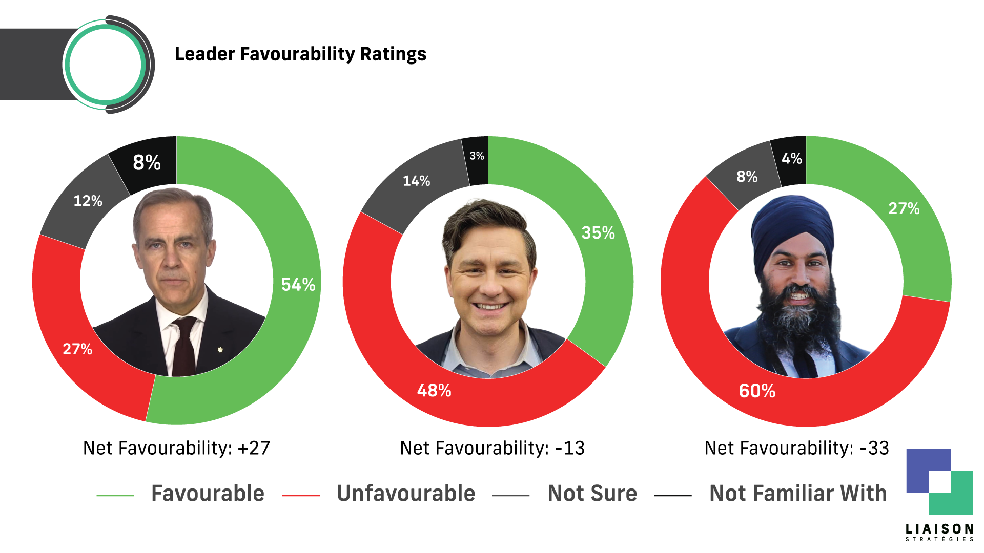 We took a look at leader favourability ratings - and unsurprisingly, given current party support levels, Mr. Carney comes out on top with a net +27 rating. He’s followed by Mr. Poilievre at -13 and Mr. Singh at -33.