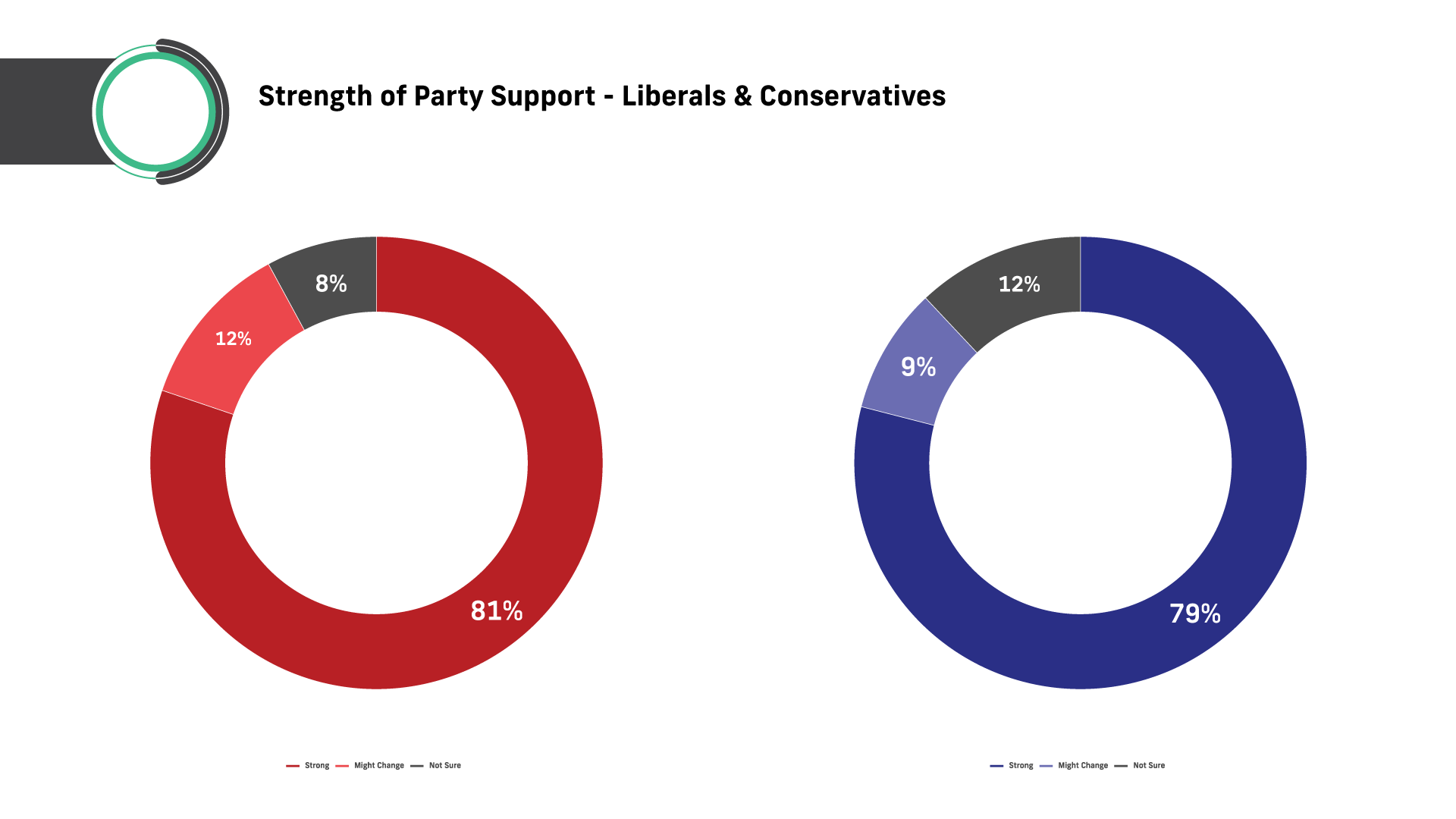 Lastly, we examined how firmly voters are committed to their chosen parties. Among Liberals, 81% say they are strong supporters and unlikely to change their minds—nearly identical to the 79% of Conservatives who say the same. These are comparable levels of voter loyalty.