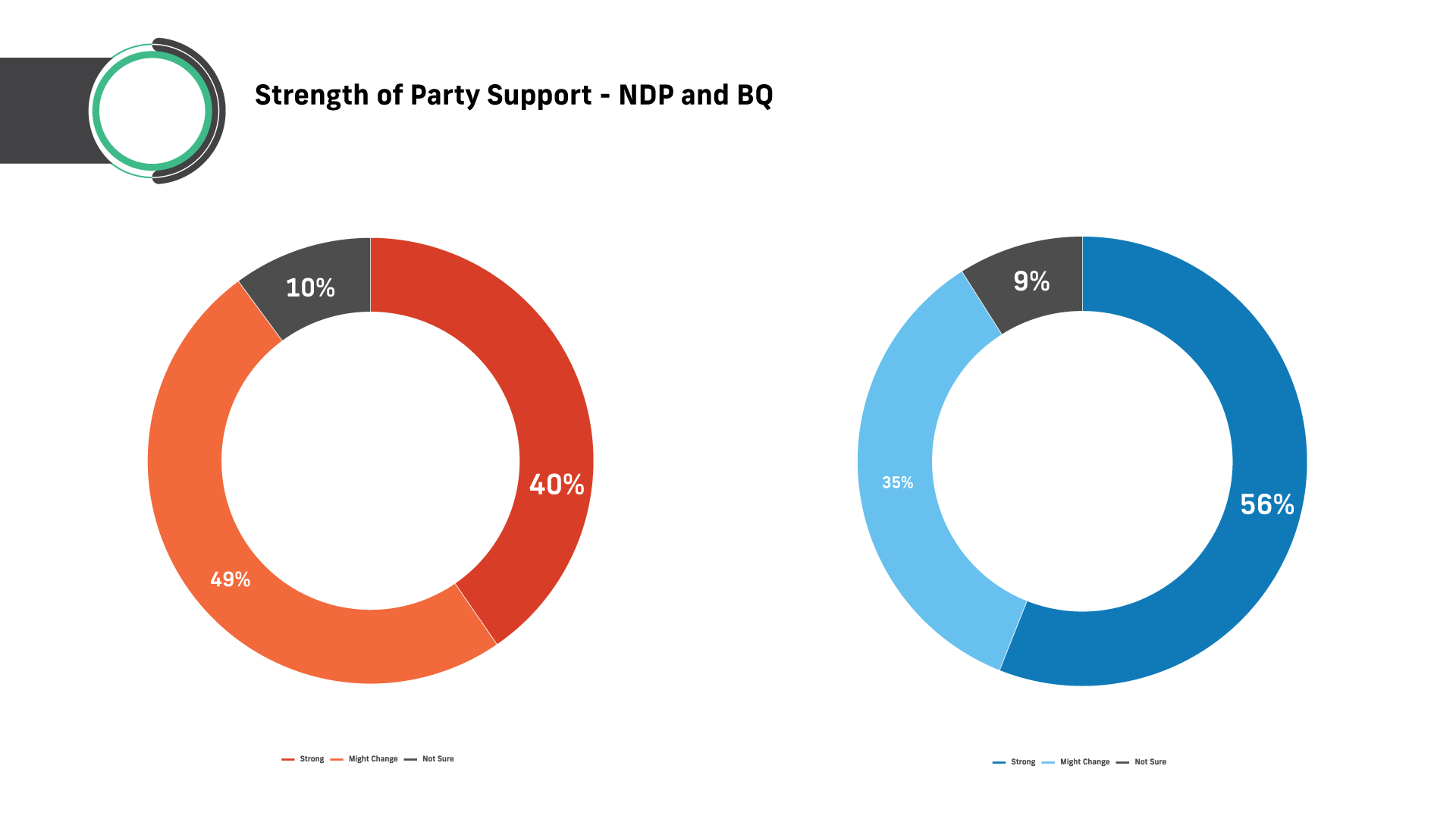 For the NDP, however—even at just 5% support—49% of their voters say they could still change their minds and back another party. Meanwhile, 56% of Bloc supporters consider themselves firmly committed, while 35% say they might reconsider.