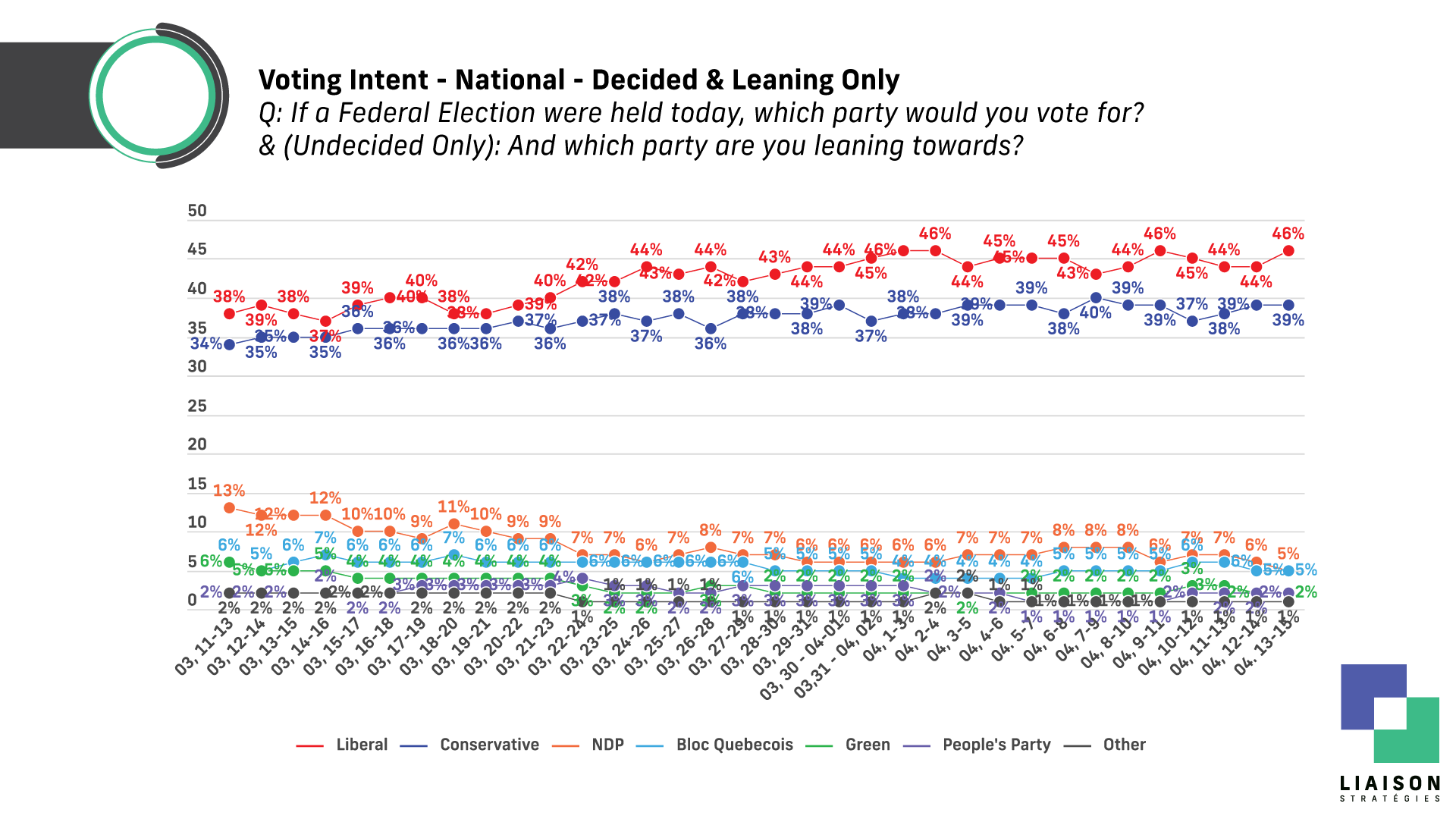 April 16, 2025 (Toronto, ON) – A new poll by Liaison Strategies for the National Ethnic Press and Media Council of Canada (NEPMCC), the industry association representing Canada’s non-official language newspapers, TV, radio, and online news media, finds the Liberals leading with 46% (+2) to the Conservatives 39% (no change).