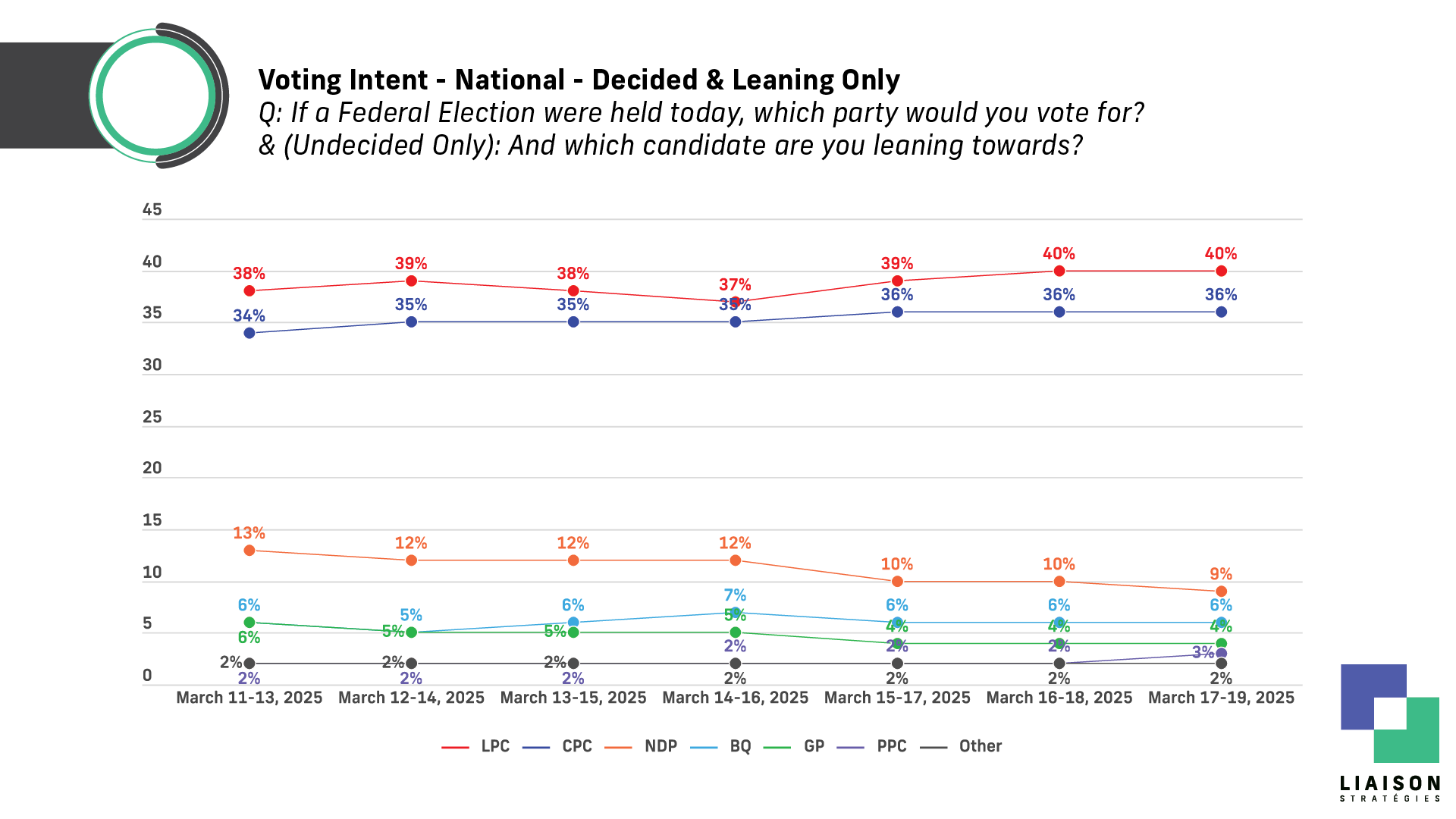 "Today's tracking shows the Liberals holding steady at 40% for the second day in a row, while the Conservatives remain four points behind at 36%. Meanwhile, the NDP’s rough streak continues, hitting a new low of 9%," said David Valentin, Principal at Liaison Strategies.