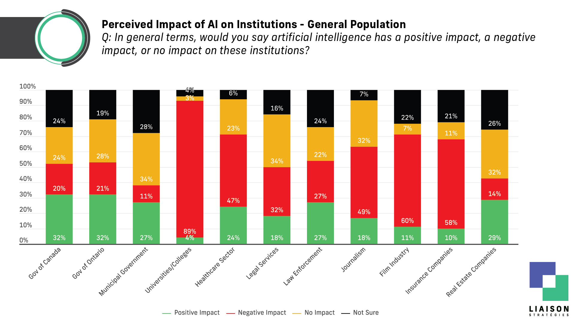 The survey points to a Trust Catastrophe in institutions. Ontarians report negative impacts for universities (89%), film (60%), insurance (58%), and healthcare (47%).