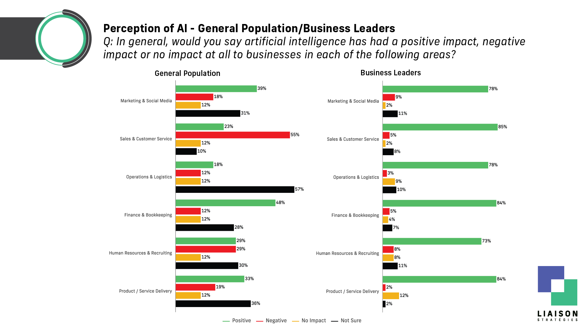 There’s also a Perception Chasm. Business leaders see AI as overwhelmingly positive, with up to 85% citing benefits, while the public is far more skeptical. A majority (55%) believe AI is hurting sales and customer service, and only finance earns modest support.