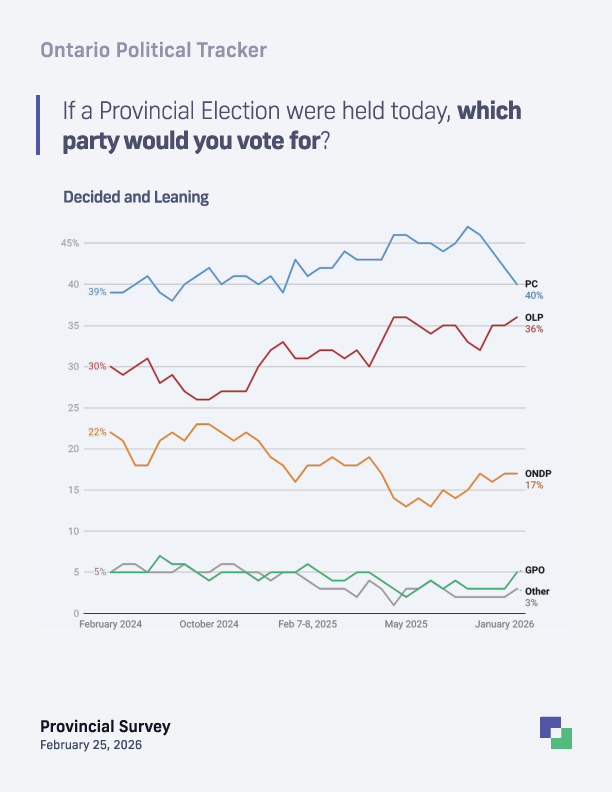 February 25, 2026 (Toronto, ON) – A new Liaison Strategies of Ontario reveals a tightening provincial race, with the Progressive Conservatives (PCs) and the Ontario Liberal Party (OLP) nearly neck-and-neck among decided and leaning voters. The PCs led by Doug Ford would garner 40% of the decided and leaning vote, followed closely by the Ontario Liberals at 36%. The Ontario NDP sits at 17%, with the Green Party at 5%.