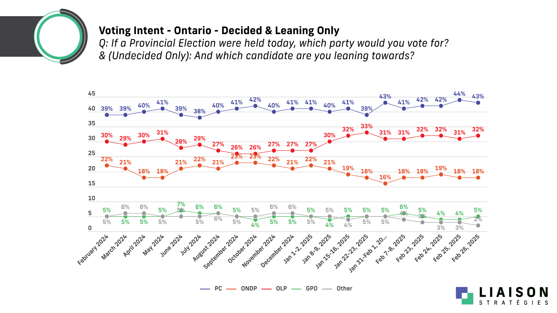 The survey, conducted February 26th, 2025, using interactive voice response technology, polled 789 Ontario voters. The poll has a margin of error of +/- 3.48%, 19 times out of 20. Liaison Strategies is a member of the Canadian Research Insights Council (CRIC).