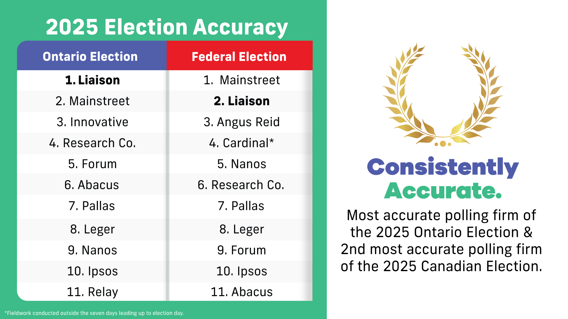 Liaison Strategies is one of the most accurate polling firms in Canada. It ranked #1 in accuracy in the 2025 Ontario election and #2 nationally in the 2025 federal election. Liaison is a member of the Canadian Research Insights Council (CRIC).