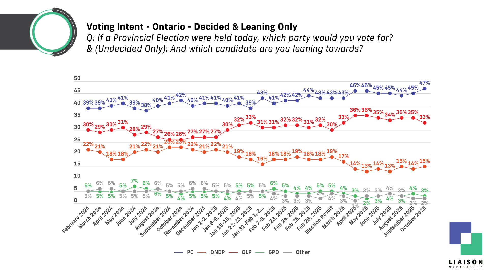 October 20 (Toronto, ON) – As the Ontario Legislature returns a new Liaison Strategies survey of 800 Ontarians shows the PCs with a commanding lead if an election were held today. This poll first appeared in Focus Ontario.