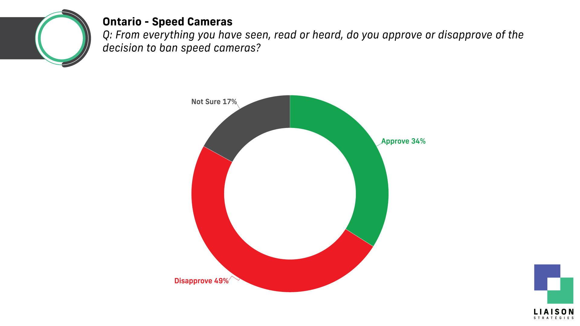 Meanwhile most Ontarians disapprove of Premier Doug Ford’s decision to ban municipal speed cameras and nearly two-thirds say they would support cameras if they were restricted to school zones.