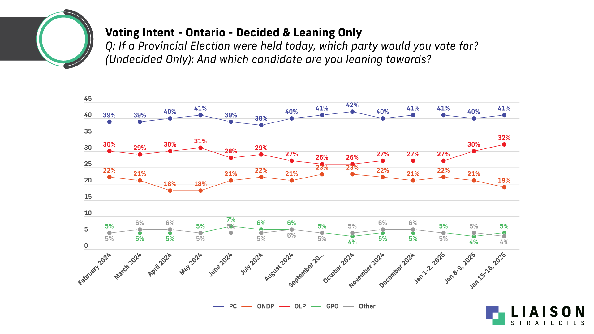 January 20, 2025 (Toronto, ON) – A new Liaison Strategies poll for the National Ethnic Press and Media Council of Canada (NEPMCC) finds Doug Ford PCs leading Bonnie Crombie's Ontario Liberals by 9 points while the undecided rate increases.