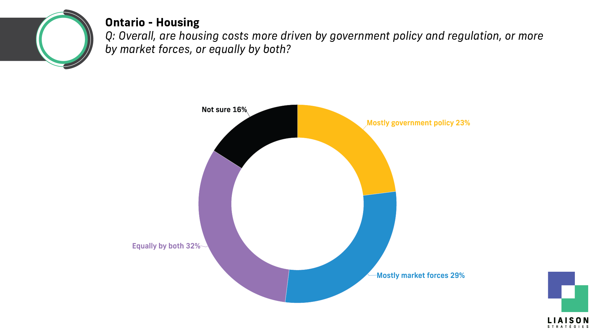 When asked whether housing costs are shaped more by government or by market forces, Ontarians are divided. Twenty-three percent say government policy has the most impact, 29% point to market forces, and 32% believe both play an equal role.