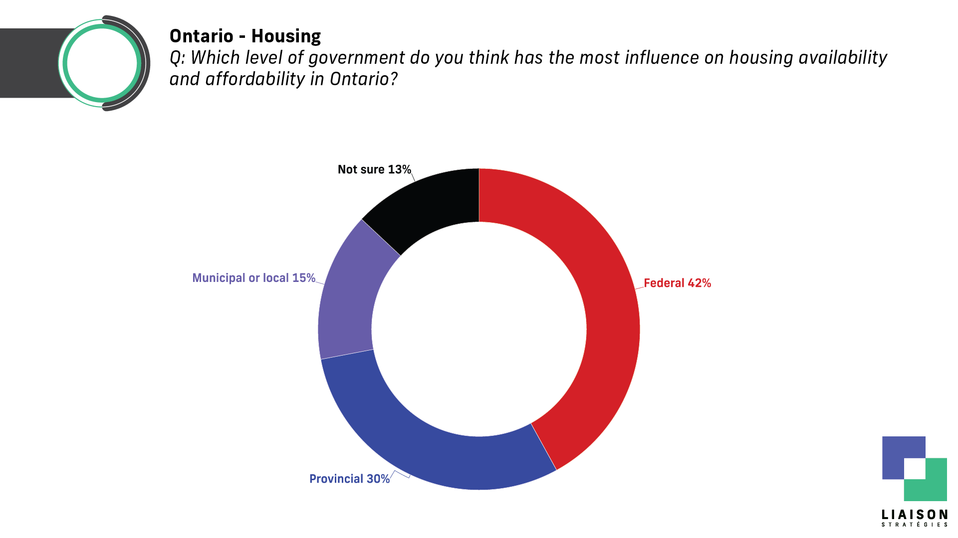 Furthermore, 42% of Ontarians say the federal government has the most influence on housing availability and affordability. While Ottawa certainly plays a role, experts would argue that municipal governments have just as much, if not more, influence over how and where housing gets built. Yet only 15% of Ontarians point to their municipal or local government as having the most influence. Only in Toronto is the number significantly higher (27%).