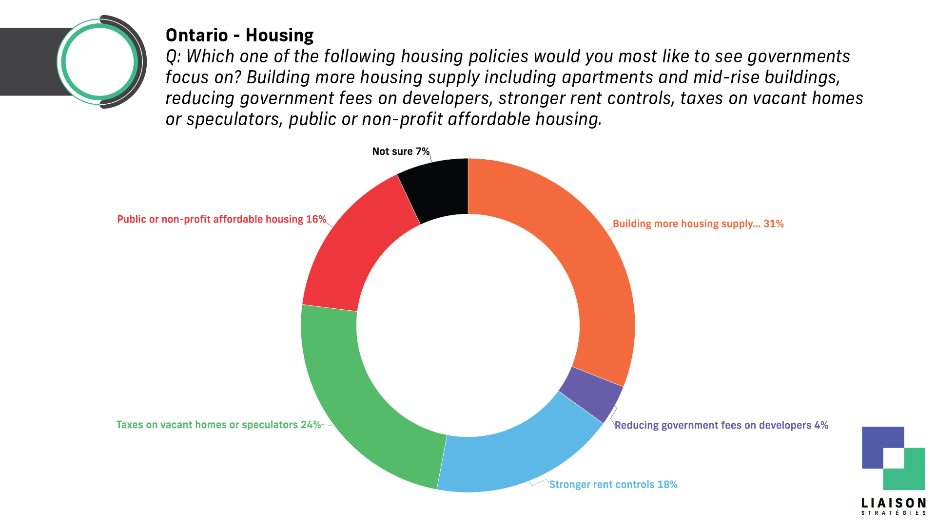 Lastly, we asked Ontarians what solutions they want governments to prioritize. The top choice is building more housing supply, selected by 31%. This is followed by taxes on vacant homes and speculators. Stronger rent control is supported by 18%, while 16% favour more public or non-profit housing. Reducing fees on developers draws little support at just 4%.