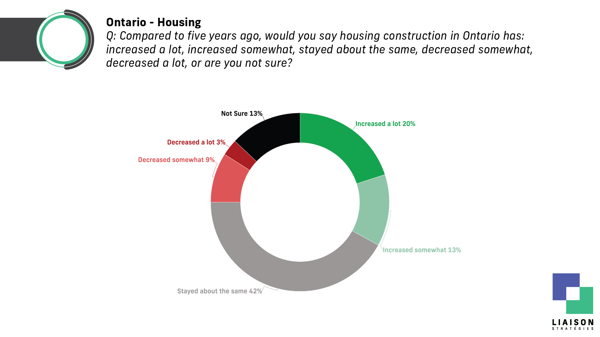 Forty-two percent of Ontarians said they believe housing construction has remained about the same compared to five years ago. Another 33% said it has increased somewhat, while just 12% correctly identified that construction has in fact decreased. Housing starts in Ontario are down, especially in Toronto, compared to five years ago. Only 12% of Torontonians say construction has decreased - the same as the Ontario average.