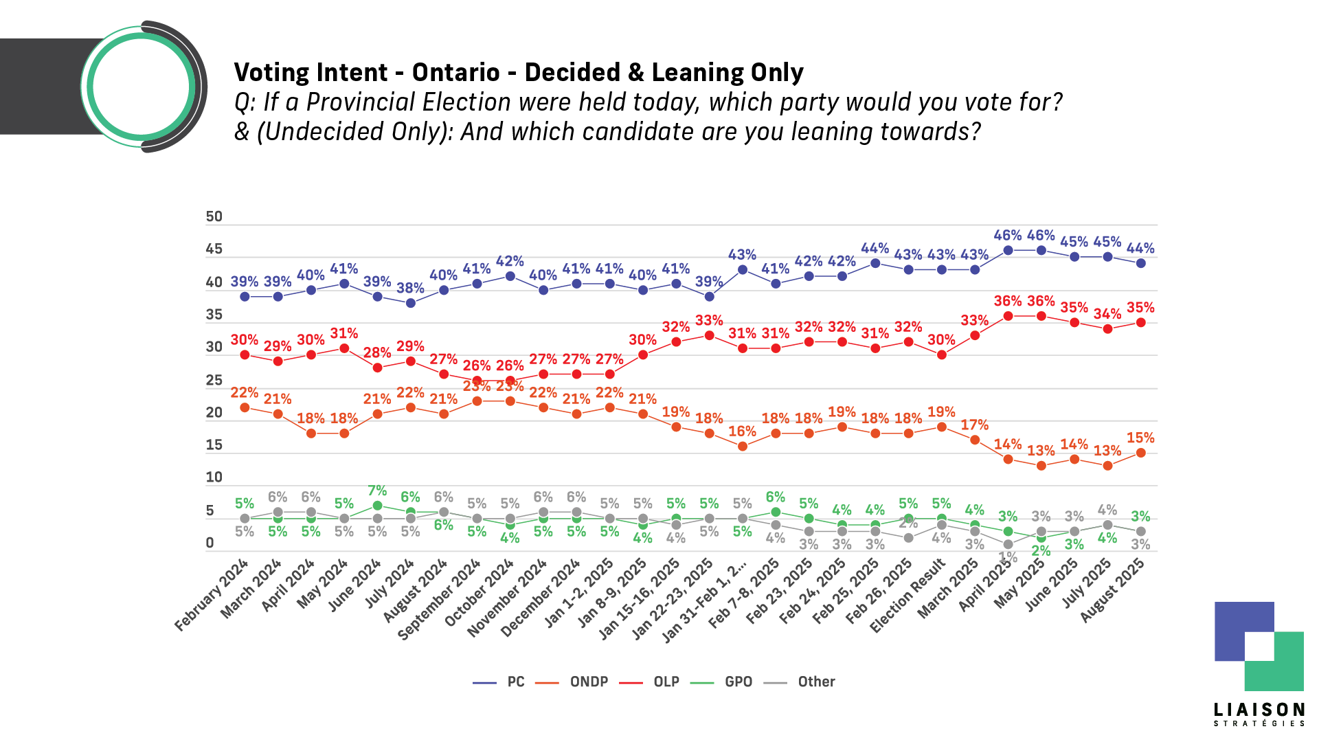 August 29 (Toronto, ON) – A new Liaison Strategies survey of 800 Ontarians shows the province is deeply divided on housing, with sharp contrasts over what drives costs and what governments should do. The poll also finds the Ontario PCs leading the Ontario Liberals by nine points if an election were held today.