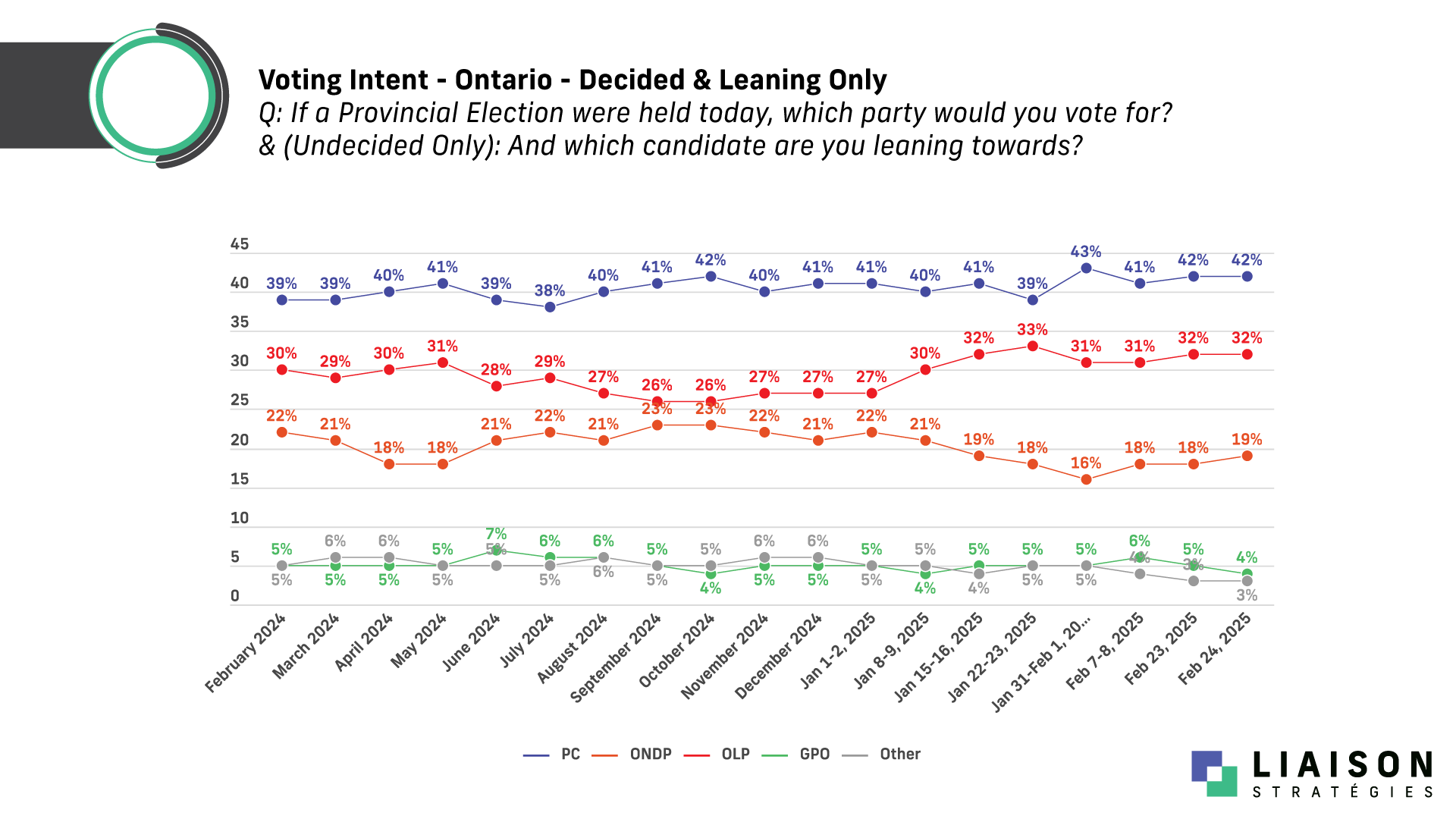The survey, conducted February 24th, 2025, using interactive voice response technology, polled 804 Ontario voters. The poll has a margin of error of +/- 3.45%, 19 times out of 20. Liaison Strategies is a member of the Canadian Research Insights Council (CRIC).