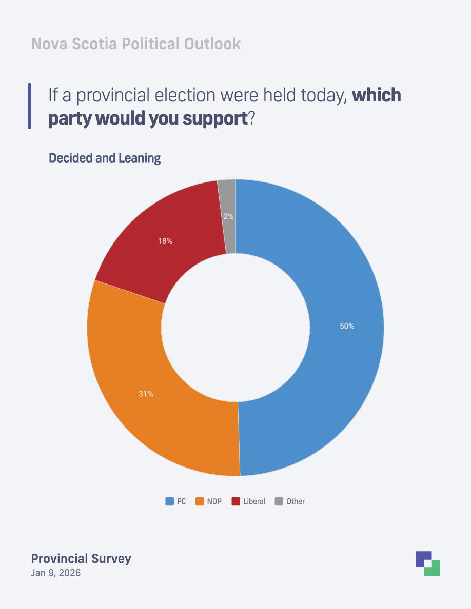 Toronto, ON (January 9, 2026) – A new Liaison Strategies survey of Nova Scotia voters finds Premier Tim Houston’s Progressive Conservatives holding a 19-point lead on ballot support and strong numbers on approval, healthcare, and the province’s relationship with Ottawa but the province-wide numbers mask an NDP lead in Halifax where the opposition party leads 40% to 31%.