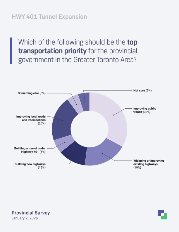 While the government leads in the horse race, their signature Highway 401 tunnel proposal is facing a uphill climb with the public. Only 28% of Ontarians support the project, while 45% are opposed. When asked to choose the top transportation priority for the GTA, only 6% of respondents chose the tunnel. Instead, 33% say the priority should be improving public transit, followed by improving local roads and intersections at 20%.