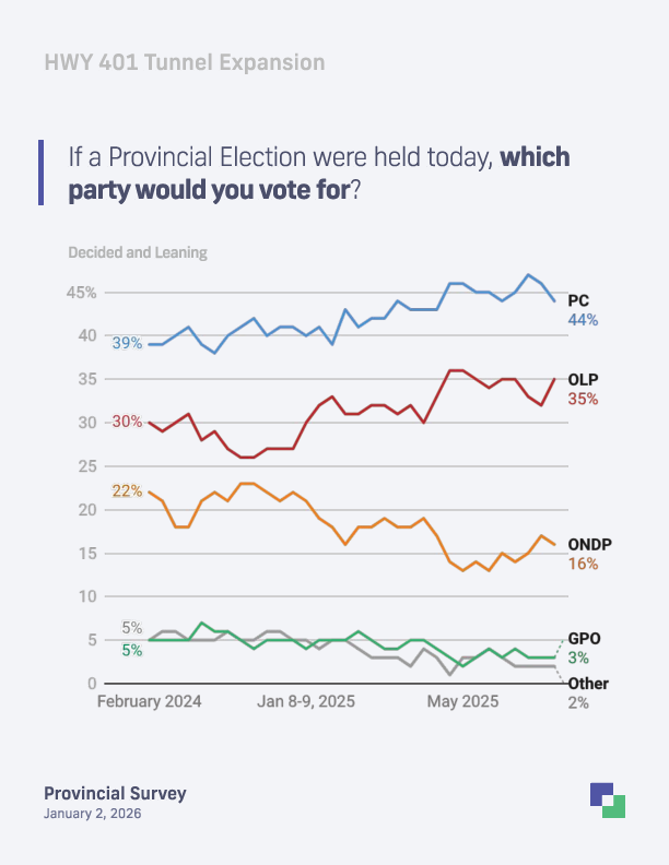 January 2, 2026 (Toronto, ON) – A new Liaison Strategies poll conducted for Focus Ontario shows the governing Progressive Conservatives maintaining a 9-point lead over the Ontario Liberals among decided voters. However, the survey also finds significant public opposition to the provincial government's proposal to build a tunnel under Highway 401, with a majority of Ontarians favoring other infrastructure and social priorities.