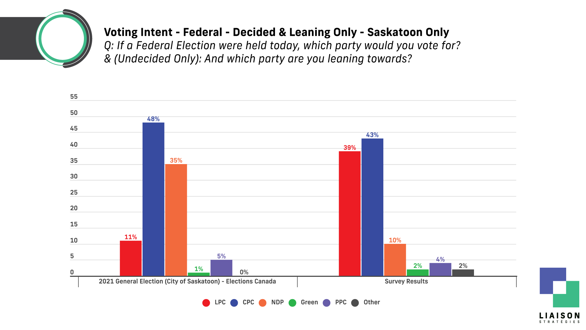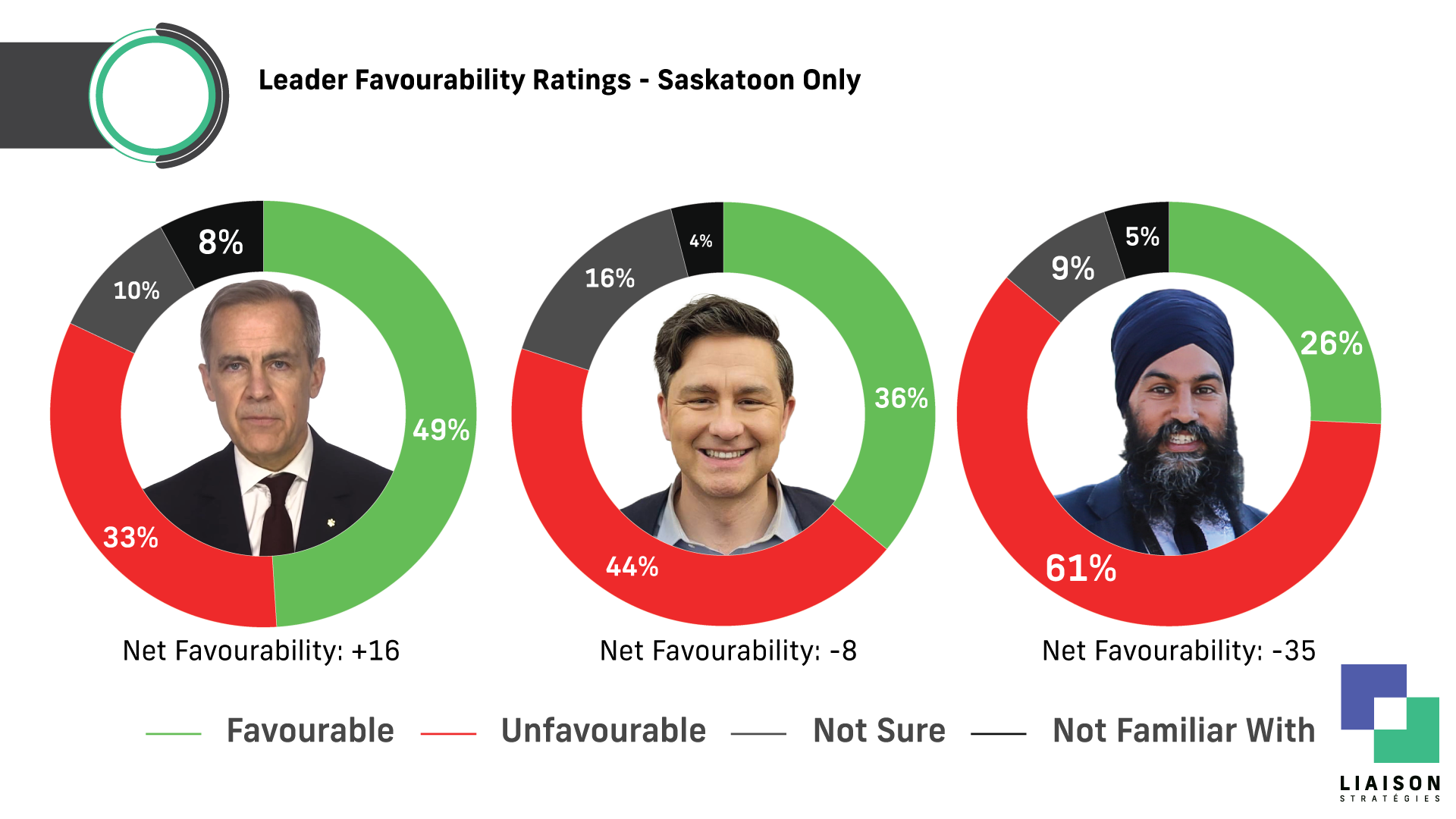 "Before the Liberals start celebrating, there are a couple of important caveats to this survey. First, this is a national poll fielded in Saskatoon - we did not test local candidate names. The Conservatives have incumbents in Saskatoon who may outperform their leader on the generic ballot."