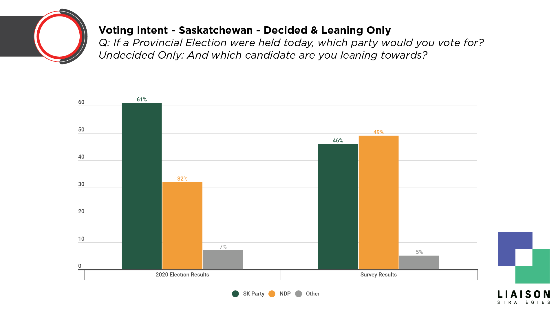 "Overall, only 9% of voters tell us they are undecided at this point. Among those decided and leaning the NDP has 49% support province-wide and the Saskatchewan Party has 46%.