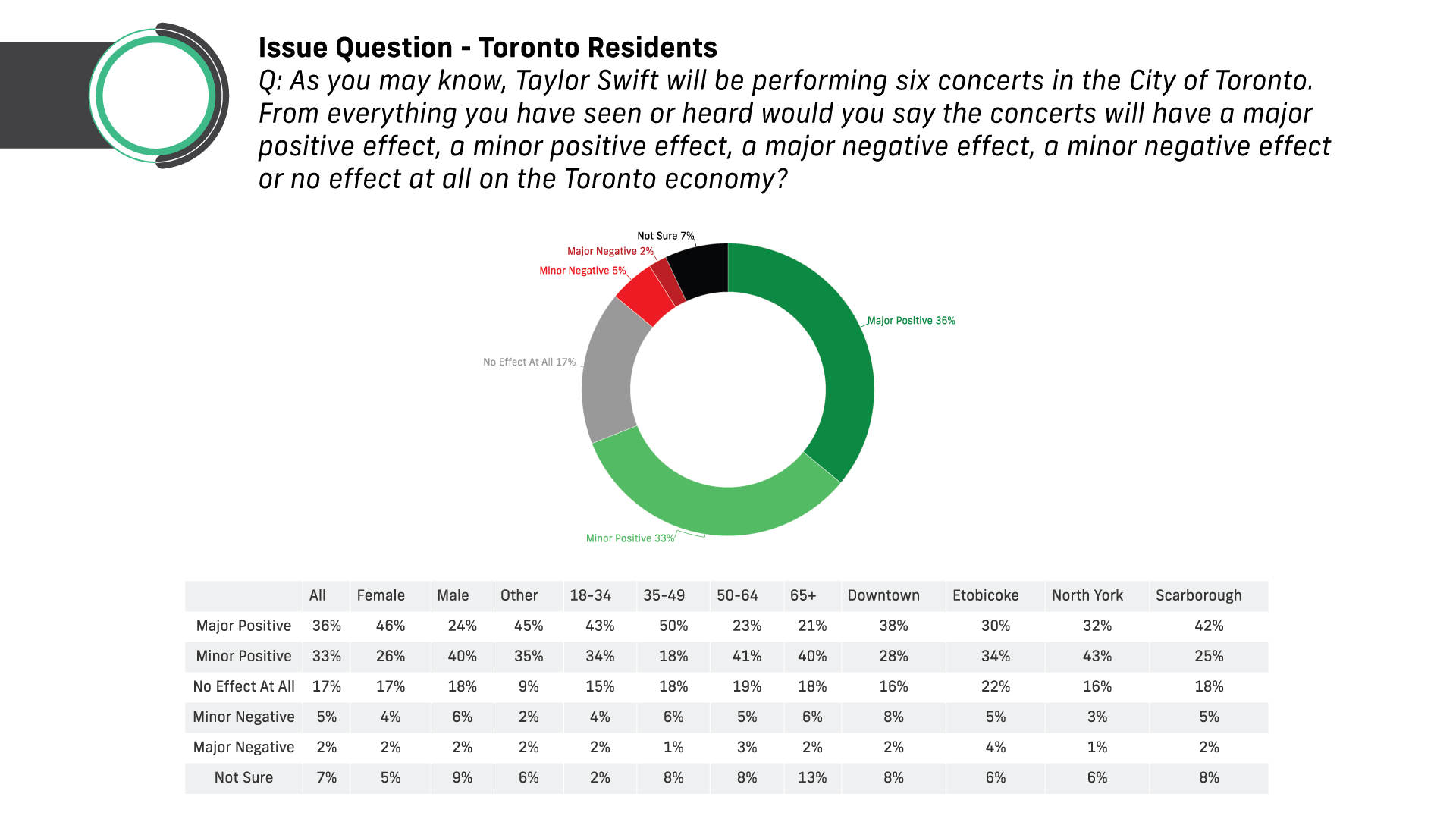 "When asked about the economic impact, 36% of respondents believe the concerts will have a major positive effect on Toronto's economy, while 33% expect a minor positive impact. Meanwhile, 17% anticipate no economic effect, and 7% foresee some level of negative impact, either major or minor," continued Valentin.