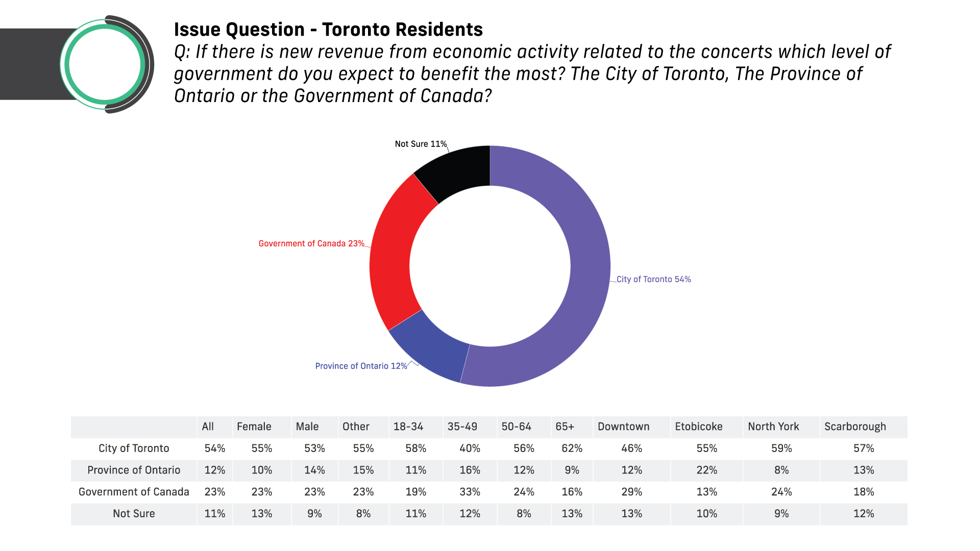 "We also asked which level of government respondents thought would benefit the most from any new revenue generated by the concerts. While 54% believed the City of Toronto would see the greatest gain, in reality, the city will benefit the least. Unlike the federal and provincial governments, which will see increased sales tax revenue, the City of Toronto’s revenue will be largely limited to funds from the hotel tax. Meanwhile, 23% of respondents expected the federal government to benefit the most, and 12% thought the Ontario government would see the greatest financial boost."