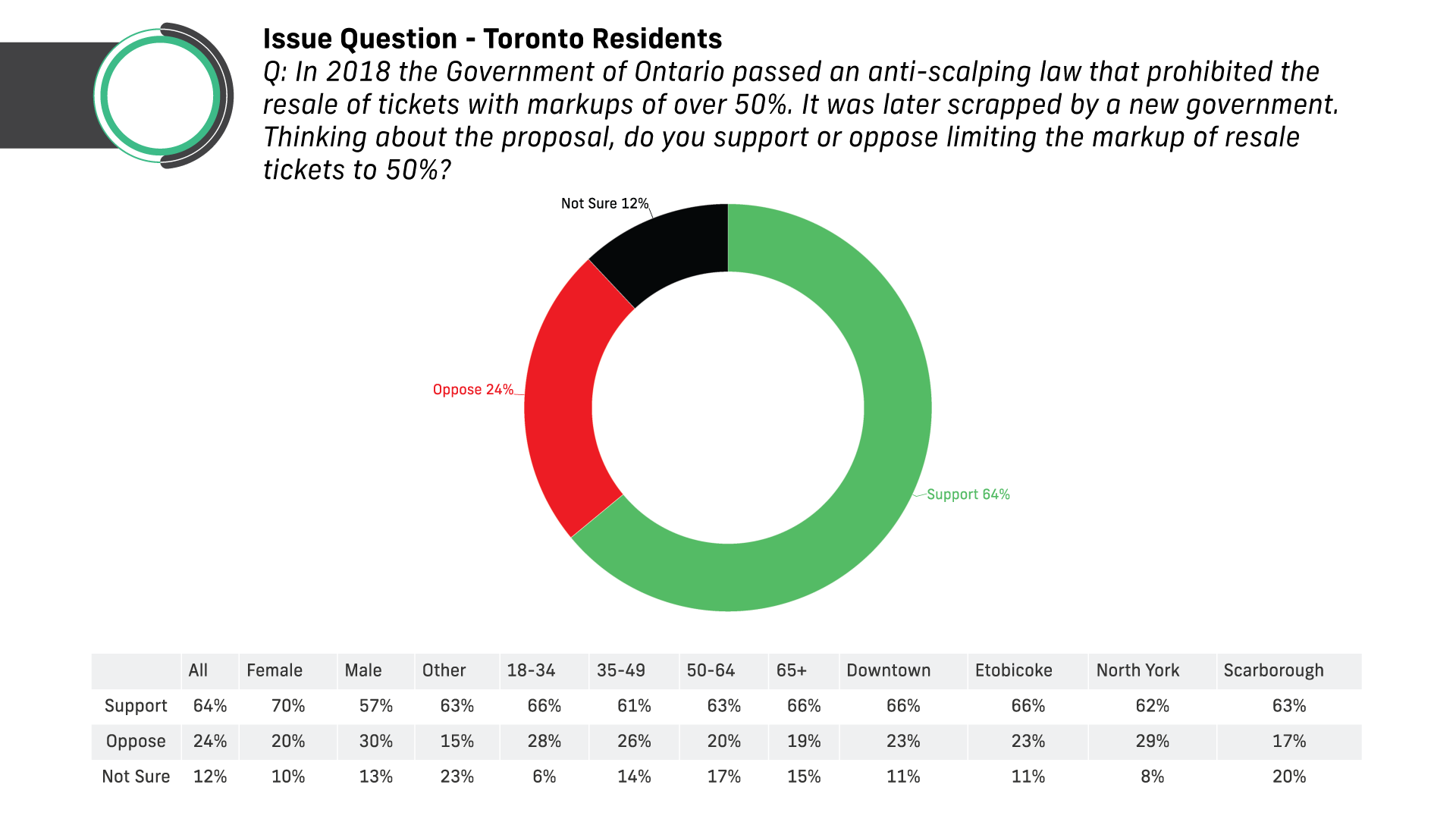 "Lastly, we gauged support for a 2018 anti-scalping law that was never implemented. The proposed law would have capped ticket resale prices at a 50% markup but was later scrapped by a new government. Today, 64% of Torontonians support this anti-scalping measure, with majority backing across all demographics and regions of the city. 'Though the law was controversial at the time and faced questions about enforceability, it’s clearly a popular idea," concluded Valentin.