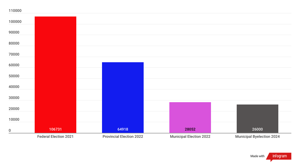 So far, 25,000-26,000 people have voted in advance according t0 the Mississauga Elections office (I gave them a call). There was a press releasing highlighting that advance poll voting was up 42% for the first weekend, but there was no press release about how many people voted on the second weekend. The office informed me that 25,000-26,000 people voted across both weekends, so this is the total votes cast so far.